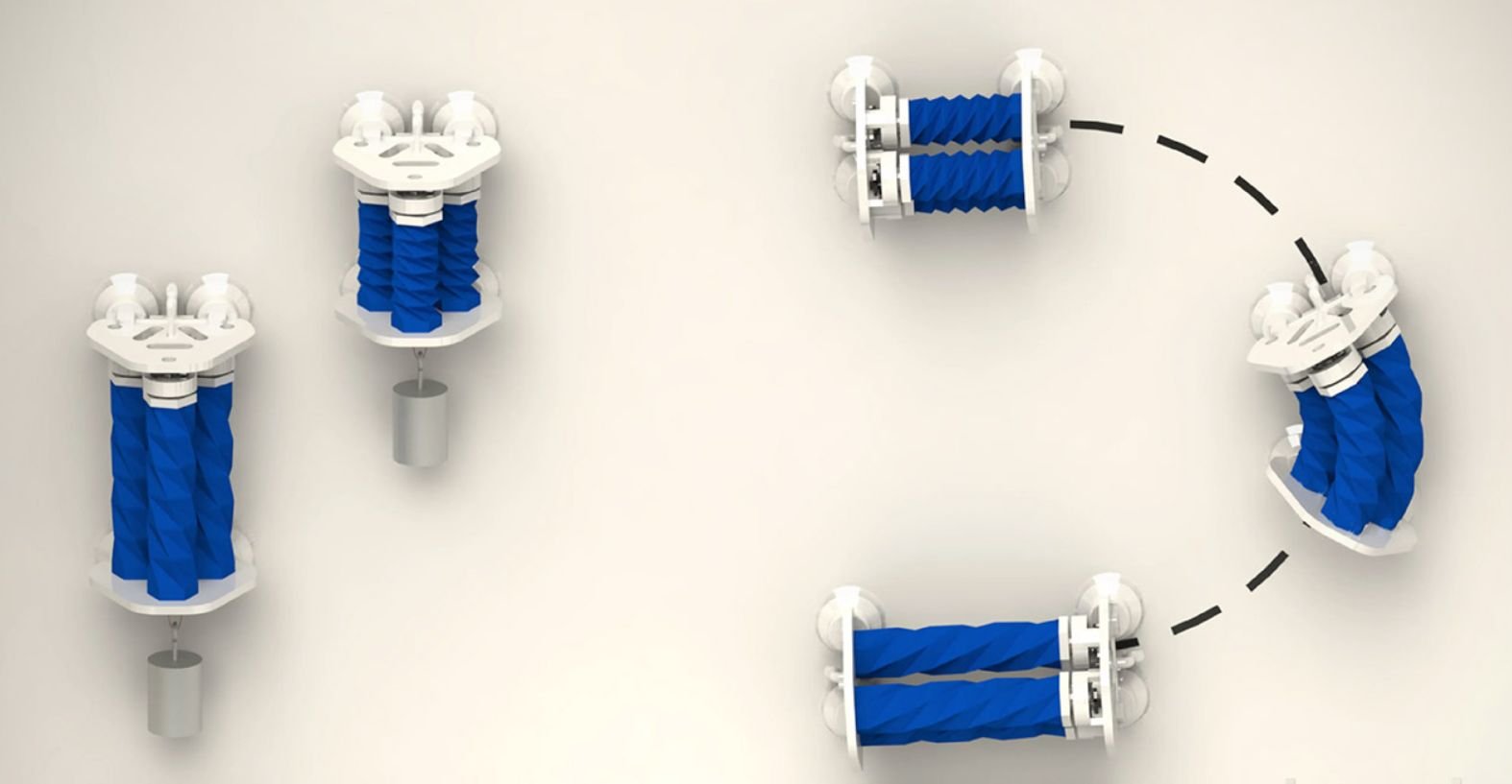 Para escalar superfícies lisas, o robô usa ventosas de silicone com design duplo, que garantem aderência sem deformar. Em testes, ele subiu paredes retas e curvadas, e até carregou mais de 500 gramas sem dificuldade. Em demonstração colaborativa, dois unidades trabalharam juntas para transitar do chão para a parede.