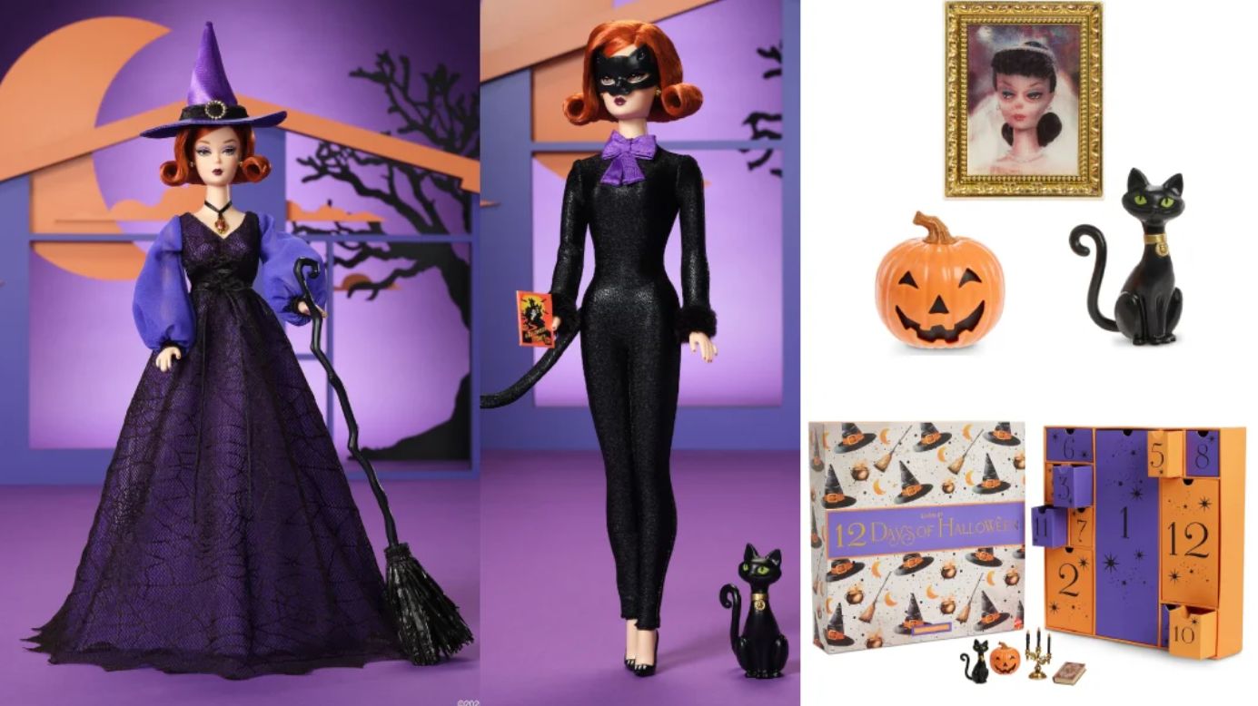 A estrela do pacote é uma Barbie vestida com um traje dramático de bruxa, saia de renda com motivos de teia de aranha, salto alto e uma manicure vermelha. Mas a magia não para por aí. Os colecionadores têm a opção de reposicioná-la em uma segunda fantasia, um corpo de gata estiloso, para variar o visual.