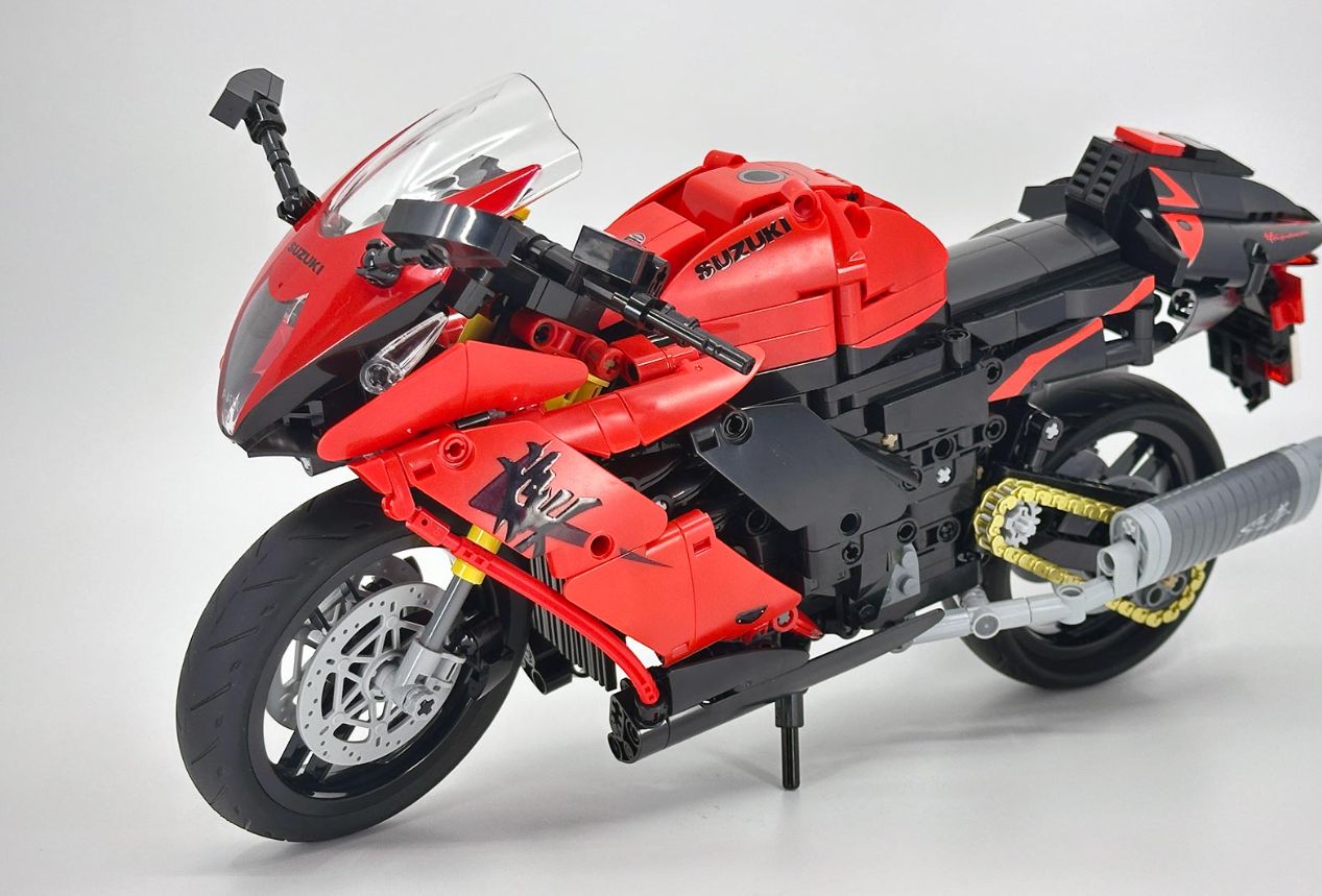 A qualidade visual do modelo final surpreende pela fidelidade ao design da edição de 25º aniversário da Hayabusa, embora as cores não correspondam perfeitamente à versão real. O vibrante laranja original dá lugar a um vermelho sólido, e os detalhes cromados do escapamento são reproduzidos em tons de cinza. Ainda assim, as curvas características da carenagem foram meticulosamente recriadas usando peças no estilo Technic, capturando a silhueta inconfundível da moto.