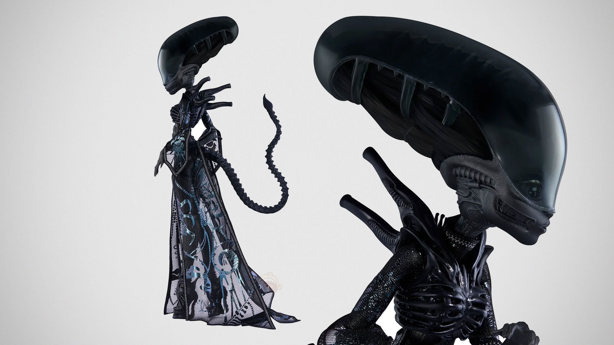E que elementos! Suas costas revelam uma armadura com tubos dorsais característicos, enquanto uma cauda segmentada e articulada se estende sinuosamente. Os pés, calçados em sandálias de salto, são uma homenagem perturbadora aos “facehuggers”, os parasitas da franquia. As mãos alongadas com dedos esqueléticos completam a silhueta inconfundível do ser.