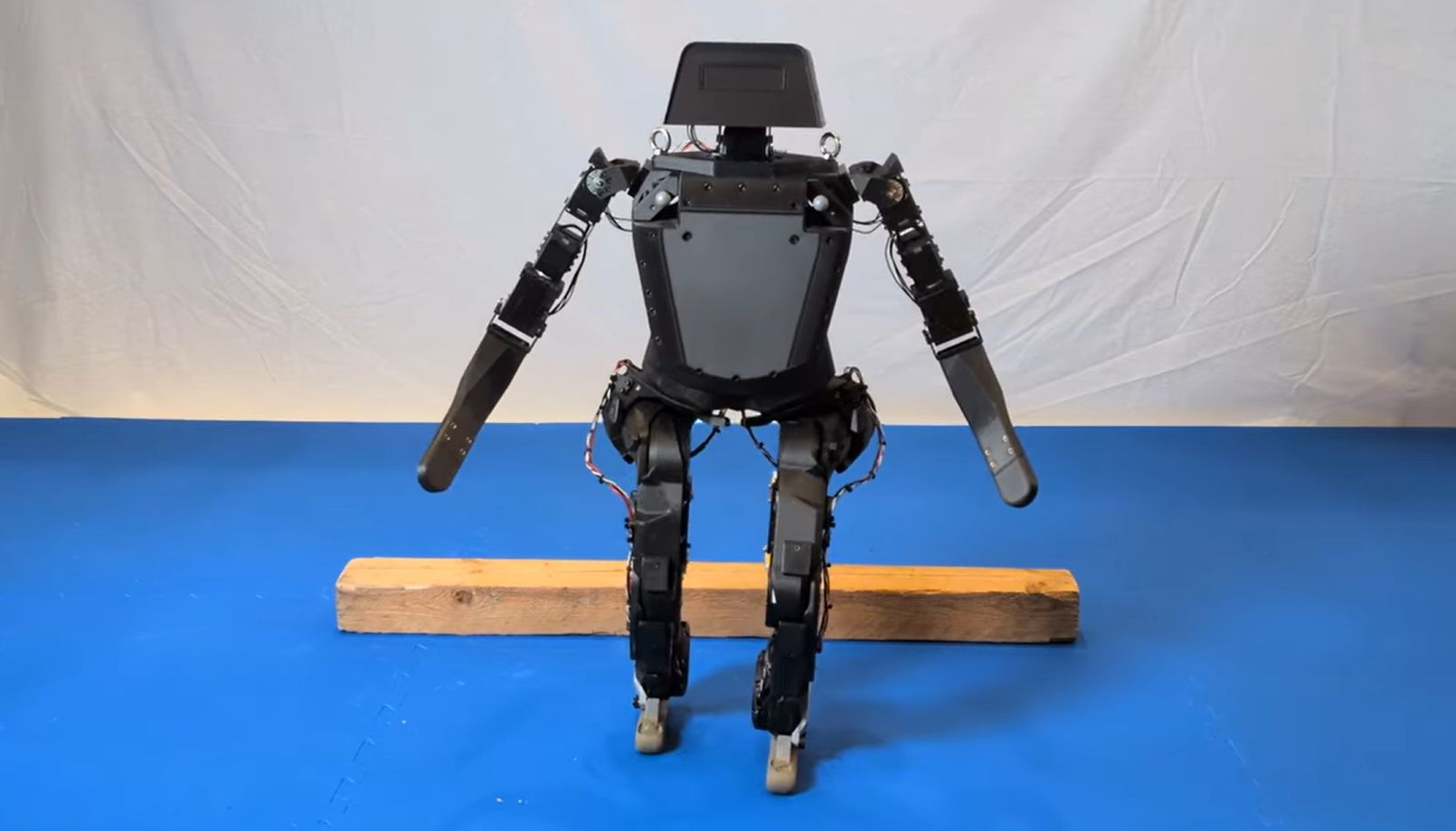 Com isso pronto, a equipe colocou a política dentro de um robô real de 16 quilos, equipado com pernas com molas e braços movidos por motores Dynamixel.