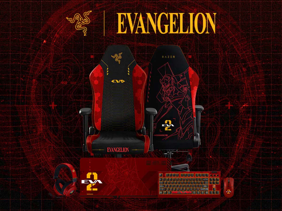 A linha Evangelion Unit-02 da Razer inclui mouse, teclado, headset, mousepad e até uma cadeira gamer. Todos os produtos receberam um redesign completo inspirado na estética da EVA-02, com cores vibrantes, símbolos da NERV e padrões visuais que remetem ao clima tecnológico e tenso da série.