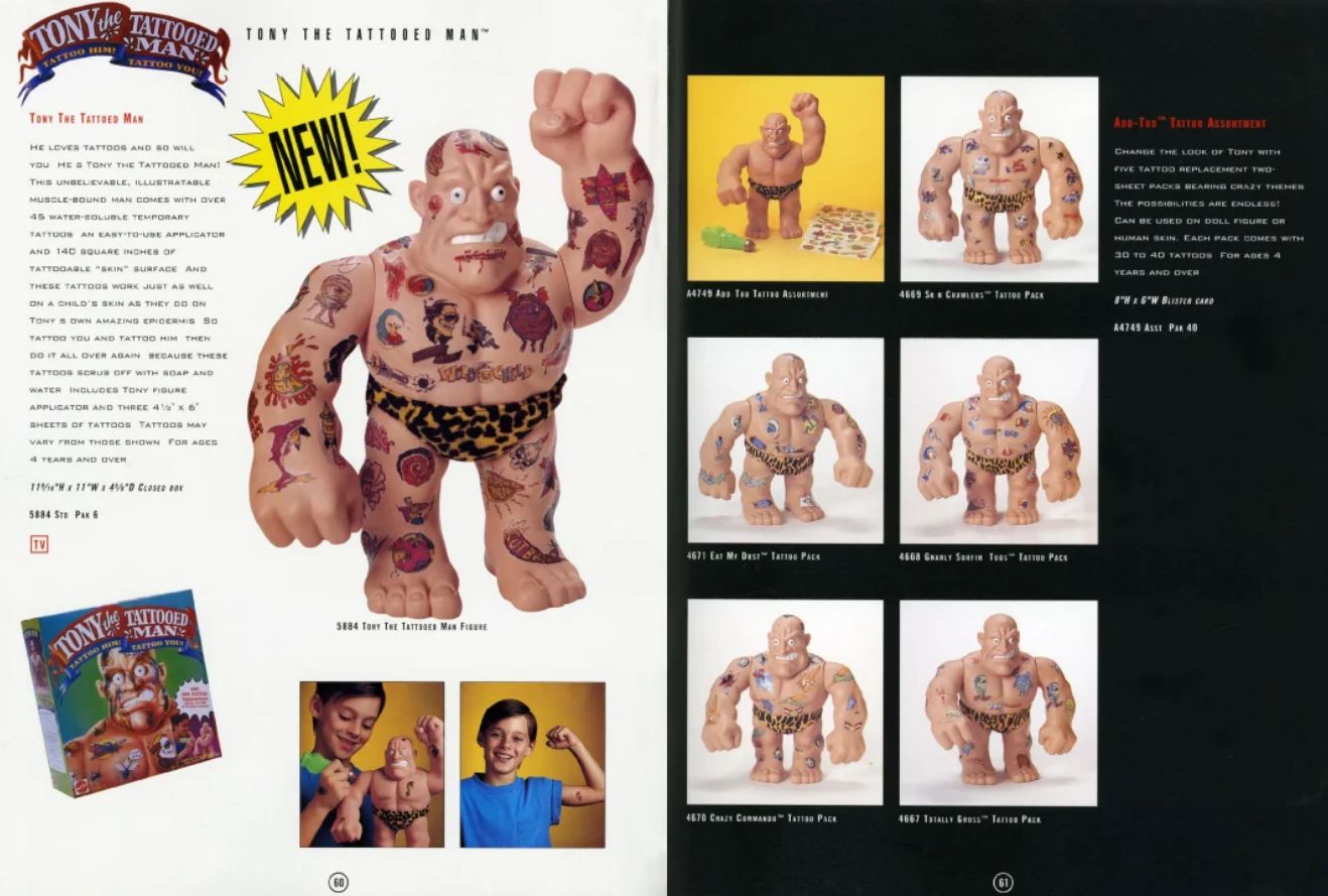 Tony the Tattooed Man não era um herói de desenho nem um personagem de franquia famosa. A graça do boneco era ser um “canvas” de tatuagens. A própria Mattel descreve o produto como um personagem musculoso que vinha com 45 tatuagens temporárias solúveis em água e uma área enorme “tatuável”, estimada em 140 polegadas quadradas.