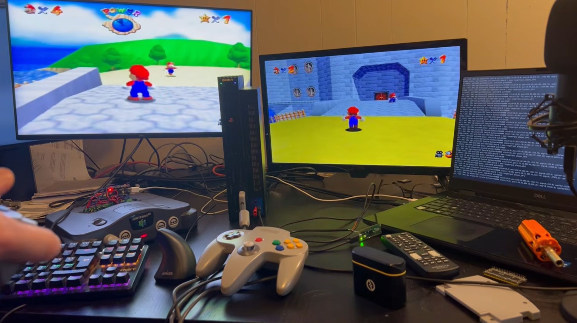 A graça aqui é que nenhuma dessas plataformas nasceu pensando em jogo online. O N64 depende de cartucho, um formato chato de adaptar para comunicação moderna. O PS2 até teve opções de rede na vida real, mas o Super Mario 64 obviamente nunca foi um jogo do console. Mesmo assim, Carl fez os dois “conversarem” com uma pilha de gambiarras elegantes e um bom tanto de engenharia.