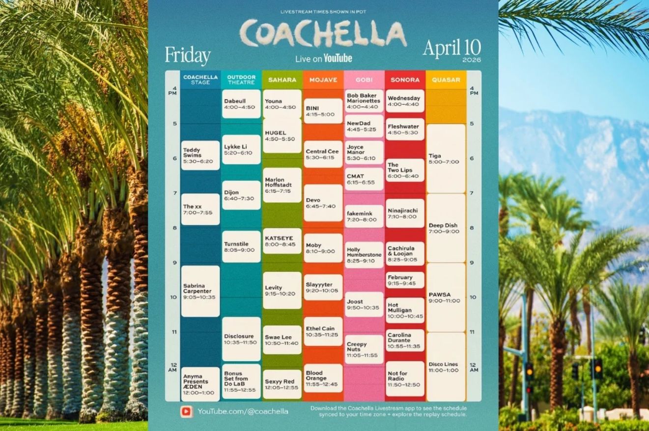 A transmissão cobre os dois fins de semana do evento, entre 10 e 12 de abril e depois de 17 a 19 de abril, direto do Empire Polo Club, na Califórnia. Todos os sete palcos do festival terão sinal ao vivo todos os dias, sem bloqueio por região ou necessidade de assinatura paga.