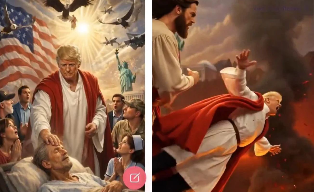 O vídeo surgiu como resposta direta a uma imagem de IA publicada dias antes por Trump em sua rede Truth Social. Na arte, o ex-presidente aparecia com vestes brancas e iluminação celestial, em uma composição que remetia à iconografia cristã. A postagem provocou críticas de líderes religiosos e aliados políticos, levando Trump a apagar a imagem pouco depois.